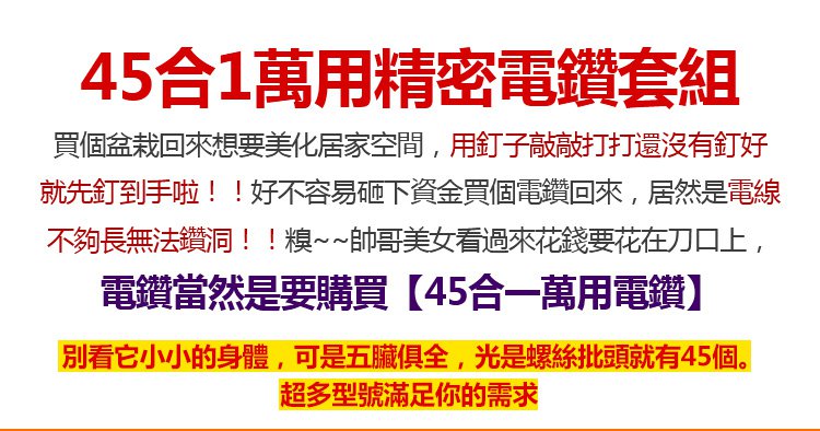 小型多功能家用電動螺絲起子機推薦,電動螺絲刀。45合一多功能充電式手電鑽工具箱、充電電動工具有最棒的商品。新款USB充電式手電鑽是以電力驅動馬達為動力,以鑽頭為軸心,其優點為結構簡單,重量輕,體積小,攜帶方便,不佔空間,操作容易等。